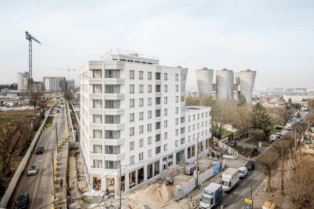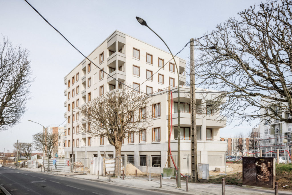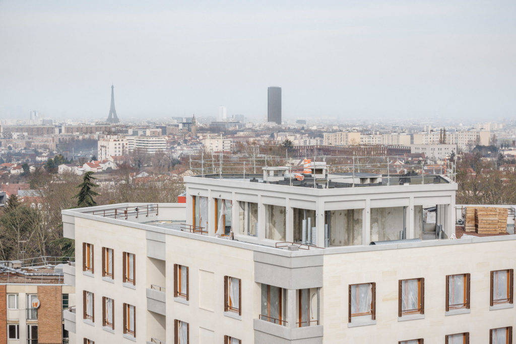 Les matériaux employés sont nobles et résonnent avec le patrimoine culturel et historique de la ville. D’une part, le béton préfabriqué du socle et des loggias assure la présence urbaine des constructions et rappelle le monument contemporain des 9 châteaux d’eau de l’architecte Jacques Charron qui marque le paysage de proximité. D’autre part, la pierre de taille porteuse en façade des logements relie les nouveaux édifices au patrimoine ancien de la ville de Villejuif comme l’église saint Cyr ou l’hôtel de la Capitainerie et des Chasses.